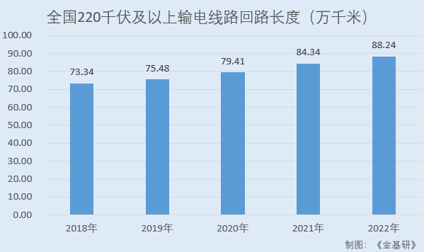以220千伏及以上输电线路为例,2018-2022年,全国220千伏及以上输电线路回路累计总长度分别为73.34万千米、75.48万千米、79.41万千米、84.34万千米、88.24万千米。过去10年每年新增220千伏及以上线路长度平均保持在3.7万千米以上。