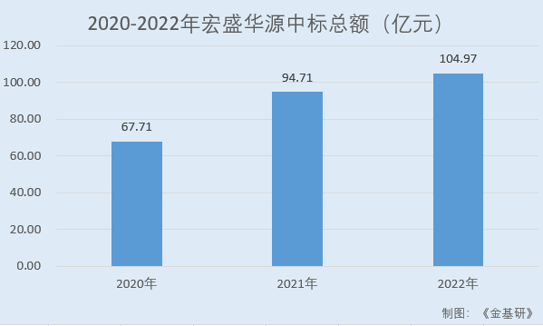 2020-2022年,宏盛华源中标总额分别为67.71亿元、94.71亿元、104.97亿元,呈持续增长趋势,年均复合增长率达24.51%。