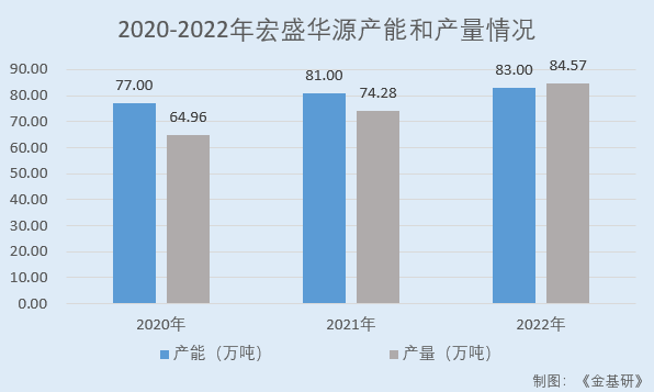 2020-2022年,宏盛华源的产能分别为77.00万吨、81.00万吨、83.00万吨;产量分别为64.96万吨、74.28万吨、84.57万吨,均呈逐年上涨趋势。其中,产能和产量均以黑件加工量进行统计,不含外协加工量。