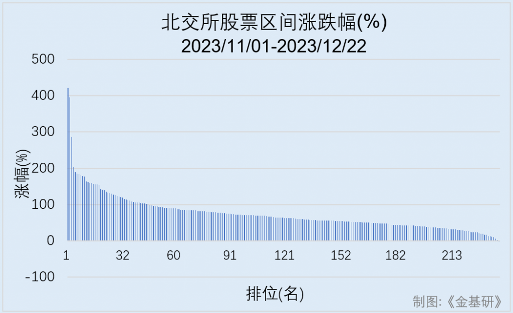 具体来看,11月1日至12月22日,北交所上市股票中,有45只股票的涨幅在100%以上,涨幅在75%至100%、50%至75%、20%至50%的股票则分别有42只、76只、64只。