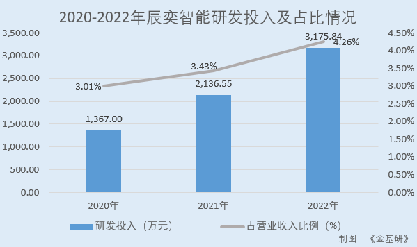 据招股书,2020-2022年,辰奕智能研发投入分别是1,367.00万元、2,136.55万元、3,175.84万元,占营业收入比例分别为3.01%、3.43%、4.26%。
