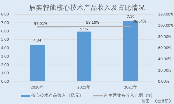 据招股书,2020-2022年,辰奕智能核心技术产品收入分别为4.34亿元、5.96亿元、7.16亿元,占主营业务收入比重分别为97.51%、98.10%、98.64%。