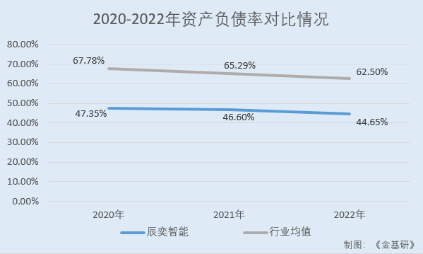 据招股书,2020-2022年,辰奕智能的资产负债率分别为47.35%、46.60%、44.65%。同期,辰奕智能同行业可比公司威达智能、迪富电子、超然科技的资产负债率均值为67.78%、65.29%、62.50%。