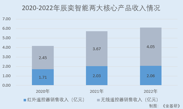 2020-2022年,辰奕智能红外遥控器销售额分别为1.71亿元、2.03亿元、2.06亿元;无线遥控器销售额分别为2.45亿元、3.67亿元、4.05亿元。
