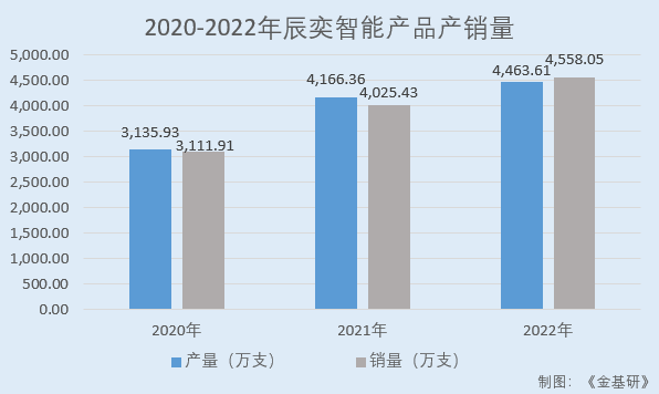 据招股书,2020-2022年,辰奕智能产品产量分别为3,135.93万支、4,166.36万支、4,463.61万支;销量分别为3,111.91万支、4,025.43万支、4,558.05万支。