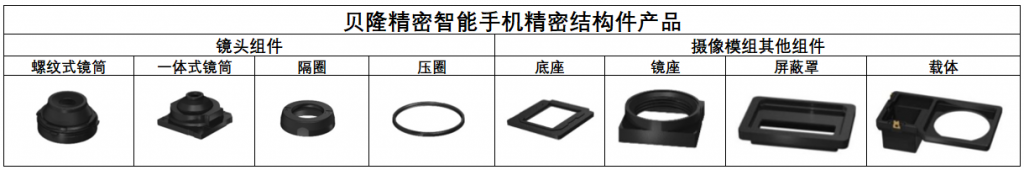在智能手机方面,贝隆精密智能手机类产品主要包括:镜头组件如镜筒、隔圈和压圈等精密结构件,摄像模组其它组件如镜座、底座、摄像模组载体及屏蔽罩等精密结构件,以及VCM马达部件。贝隆精密智能手机精密结构件主要运用于多家知名手机品牌光学摄像头。