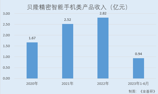 2020-2022年及2023年1-6月,贝隆精密智能手机类产品的收入分别为1.67亿元、2.52亿元、2.82亿元、0.94亿元,占主营业务收入的比重分别为66.78%、77.04%、82.47%、61.65%,是其最主要的收入来源。