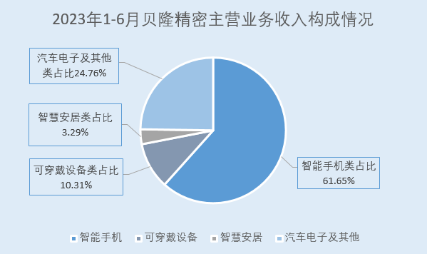 综上,贝隆精密产品最主要应用于智能手机领域,近年来贝隆精密业务模块逐步扩张,在可穿戴设备、智慧安居、汽车电子等领域均已形成一定的销售规模,形成多领域、多类型产品综合发展布局。2023年上半年,贝隆精密非智能手机类产品收入占比已超三分之一,其中汽车电子及其他类收入呈快速上涨态势。
