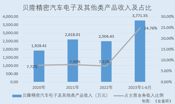 2020-2022年及2023年1-6月,贝隆精密汽车电子及其他类产品的收入分别为1,928.41万元、2,618.01万元、2,504.43万元、3,771.55万元,占主营业务收入的比重分别为7.72%、7.99%、7.32%、24.76%。