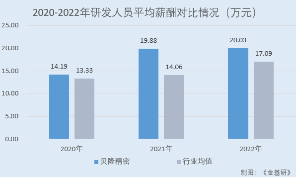 据招股书,2020-2022年,贝隆精密的研发人员平均薪酬分别为14.19万元、19.88万元、20.03万元,呈上升趋势。