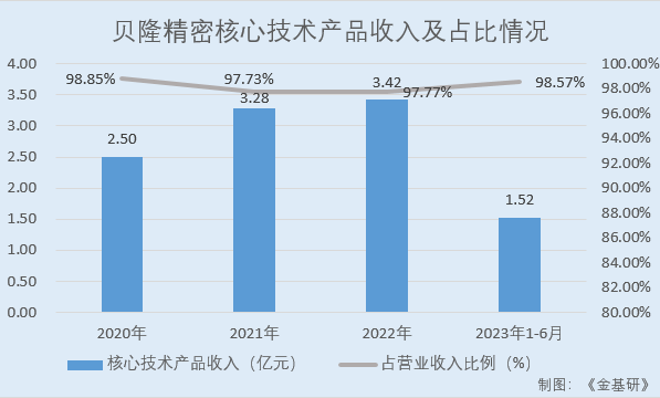 2020-2022年及2023年1-6月,贝隆精密核心技术产品收入分别为2.50亿元、3.28亿元、3.42亿元、1.52亿元,占营业收入的比重分别为98.85%、97.73%、97.77%、98.57%。