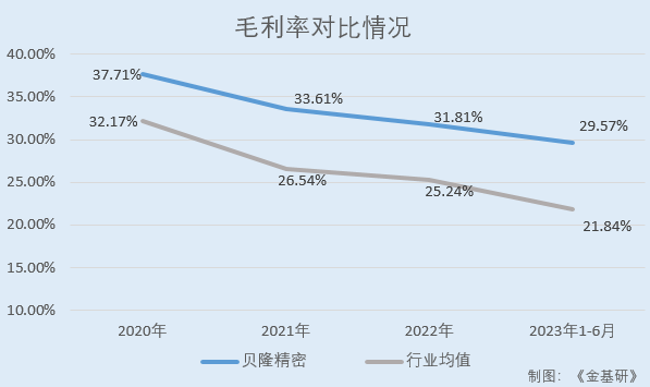 据东方财富choice数据,2020-2022年及2023年1-6月,贝隆精密的毛利率分别为37.71%、33.61%、31.81%、29.57%。