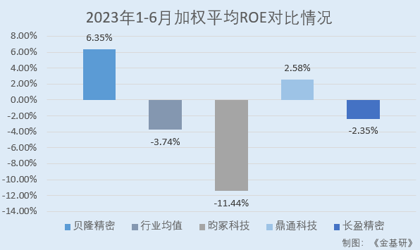 同期,贝隆精密同行业可比公司昀冢科技、鼎通科技、长盈精密的加权平均ROE均值分别为20.26%、2.81%、2.21%、-3.74%。其中,2023年1-6月,昀冢科技的加权平均ROE为-11.44%;鼎通科技的加权平均ROE为2.58%;长盈精密的加权平均ROE为-2.35%。