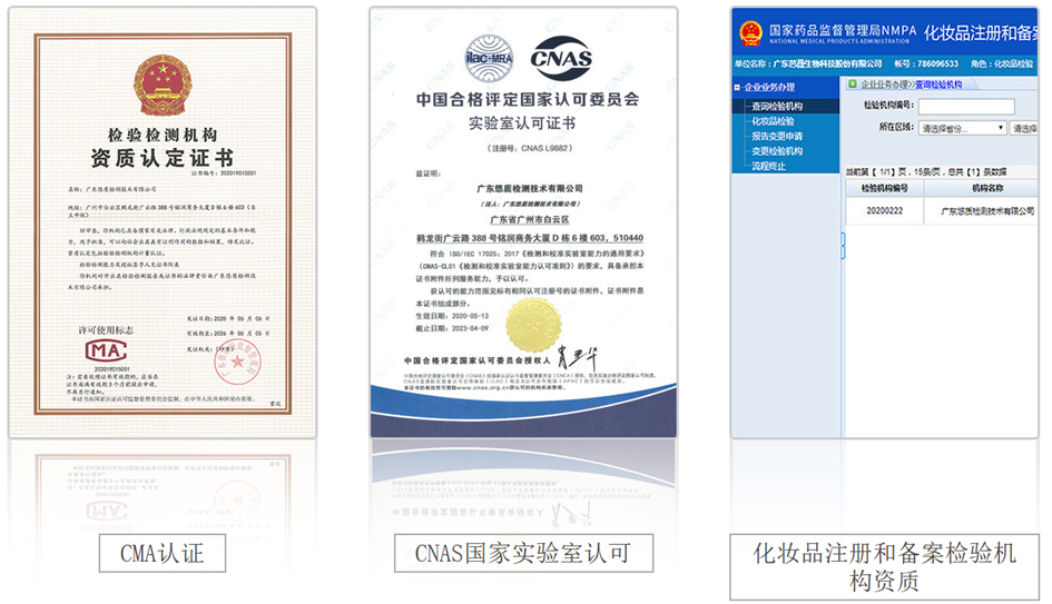 芭薇股份旗下独立的第三方检测机构——广东悠质检测技术有限公司(下称“悠质检测”)拥有200+套检测仪器设备,具备3,000+项原料检测和1,100+项检测项目的能力。目前,悠质检测已经获得CNAS国家认可委员会实验室认可证书、CMA广东省市场监督管理局检验检测机构资质认定证书、化妆品注册和备案检验机构资质(含特殊化妆品人体功效检验检测)。