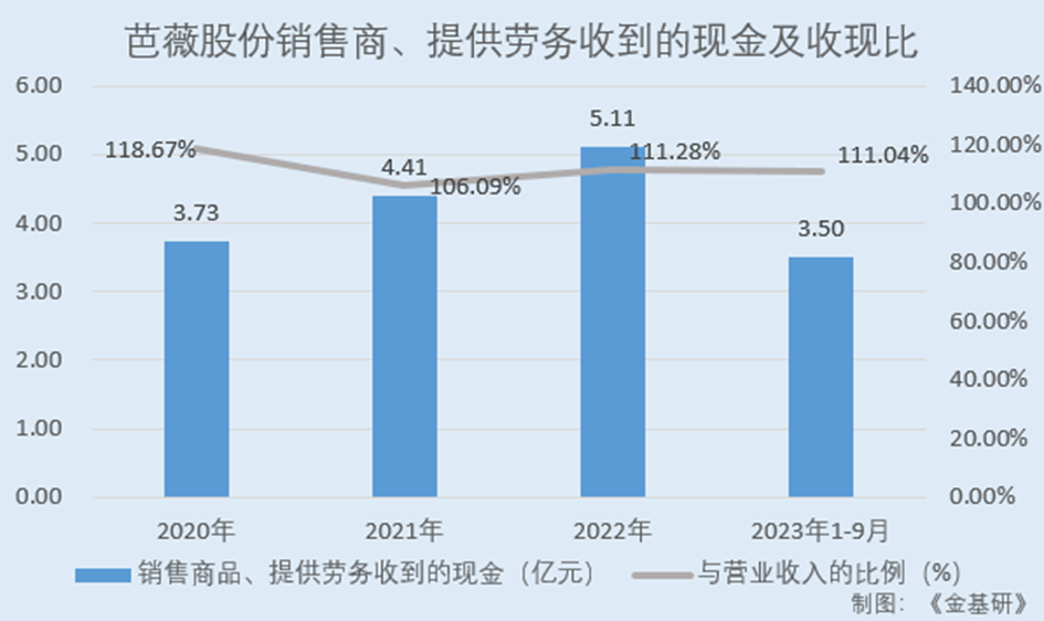 2020-2022年及2023年1-9月,芭薇股份销售商品、提供劳务收到的现金分别为3.73亿元、4.41亿元、5.11亿元、3.50亿元,占当期营业收入的比例分别为118.67%、106.09%、111.28%、111.04%。