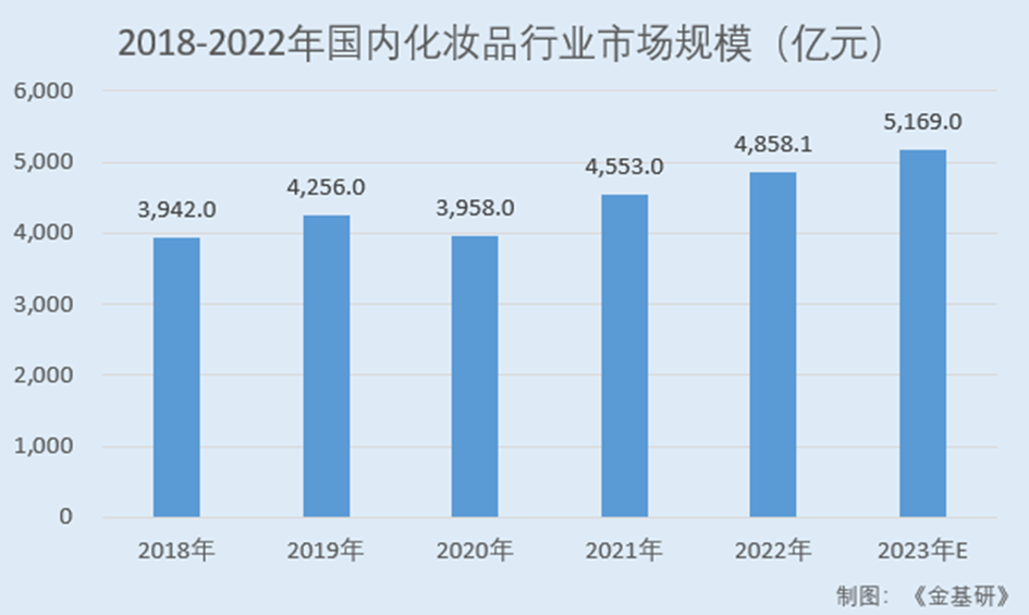 另据iiMedia Research(艾媒咨询)数据,2018-2022年,国内化妆品行业市场规模分别为3,942.0亿元、4,256.0亿元、3,958.0亿元、4,553.0亿元、4,858.1亿元。预计2023年国内化妆品行业市场规模将突破五千亿元,达到5,169.0亿元。