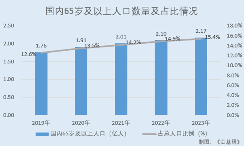 据国家统计局数据,2019-2023年,国内65岁及以上人口分别为1.76亿人、1.91亿人、2.01亿人、2.10亿人、2.17亿人,占当年度全国人口的比例分别为12.6%、13.5%、14.2%、14.9%、15.4%,国内老年人口规模庞大,老龄化人口的增速明显。