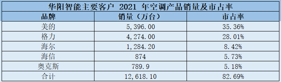 在空调细分领域,华阳智能的微特电机及组件业务有不俗的市场地位。凭借扎实的技术沉淀和优质的产品保障,华阳智能长期服务于家电行业龙头企业,是美的、海信、海尔、格力、奥克斯等知名家电集团的主要微特电机及组件供应商。华阳智能主要客户已覆盖了国内大部分空调市场,据“产业在线”数据,上述五家客户2021年空调产品市占率达82.69%。