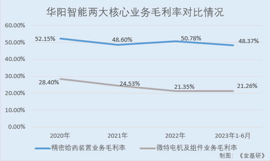 2020-2022年及2023年1-6月,华阳智能精密给药装置业务毛利率分别为52.15%、48.60%、50.78%、48.37%,微特电机及组件业务毛利率分别为28.40%、24.53%、21.35%、21.26%。