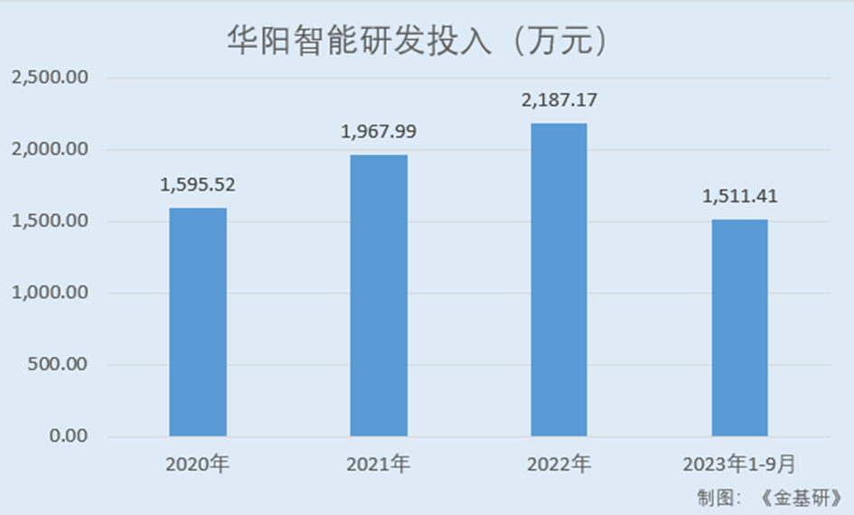 2020-2022年及2023年1-9月,华阳智能研发投入分别为1,595.52万元、1,967.99万元、2,187.17万元、1,511.41万元,2020-2022年复合增长率为17.08%。