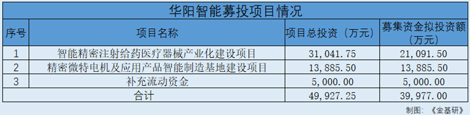 在此背景下,华阳智能此番上市拟募集资金4.00亿元分别用于“智能精密注射给药医疗器械产业化建设项目”、“精密微特电机及应用产品智能制造基地建设项目”和补充流动资金。