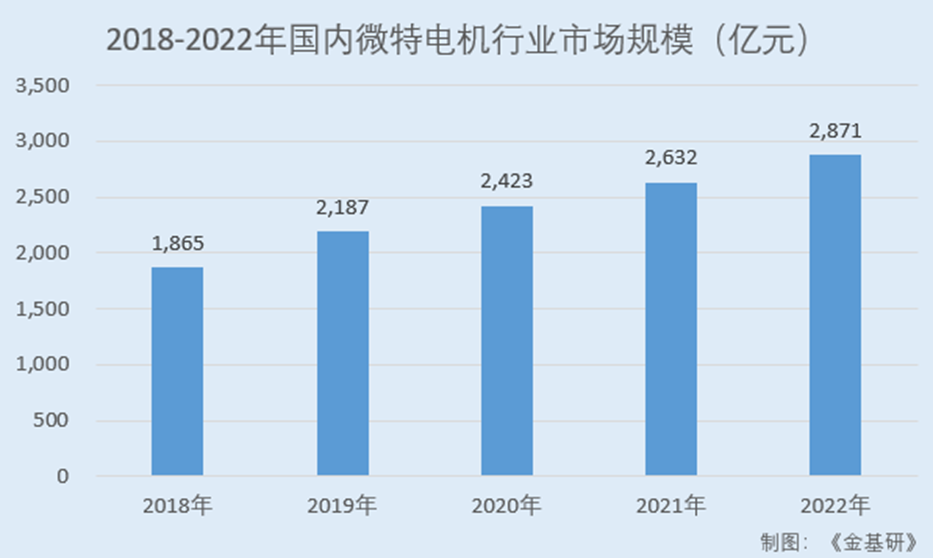 据智研瞻产业研究院数据,2018-2022年,国内微特电机行业市场规模分别为1,865亿元、2,187亿元、2,423亿元、2,632亿元、2,871亿元,年均复合增长率为11.39%。