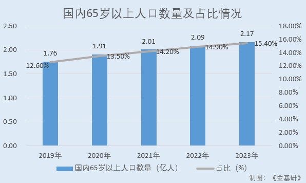 另据国家统计局数据,2019-2023年,国内65岁以上的人口分别为1.76亿人、1.91亿人、2.01亿人、2.09亿人、2.17亿人,占比分别为12.6%、13.5%、14.2%、14.9%、15.4%。