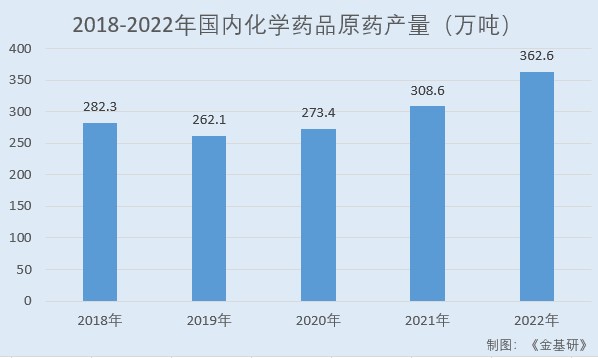 据国家统计局数据,2018-2022年,国内化学药品原药产量分别为282.3万吨、262.1万吨、273.4万吨、308.6万吨、362.6万吨。其中,2018-2019年受环保压力等因素的影响,国内化学药品原药产量有所下降。