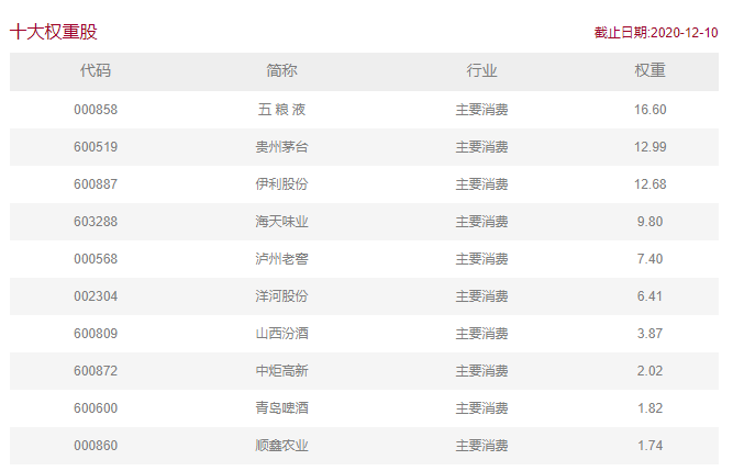 在指数的细分行业上,白酒板块占比近57.84%,其次为乳品和调味品等,前三大细分板块累计占比近85%(数据来源:Wind,取申万三级行业分类,截止2020.11.30)。