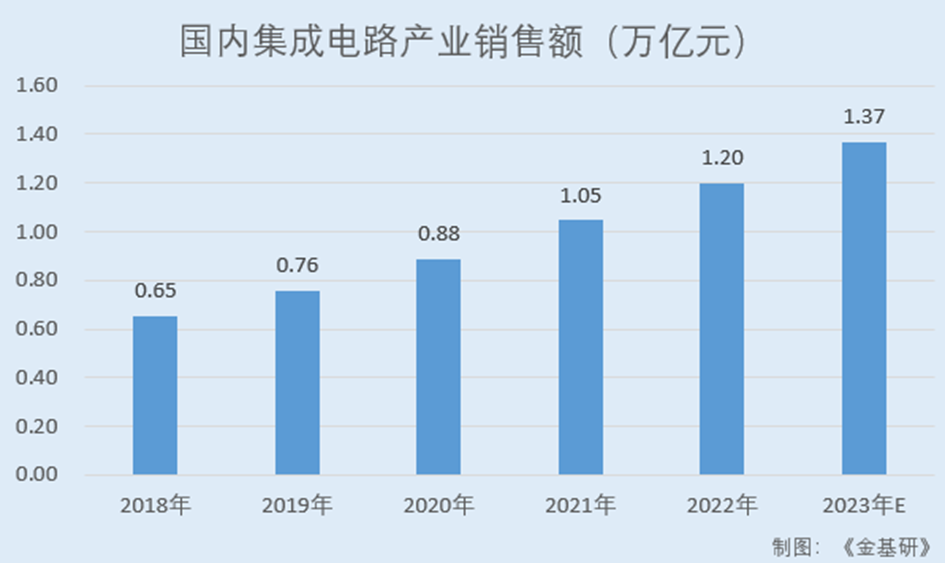 据中国半导体行业协会数据,2018-2022年,国内集成电路产业销售额分别为0.65万亿元、0.76万亿元、0.88万亿元、1.05万亿元、1.20万亿元。中投产业研究院预计,2023年国内集成电路产业销售额将达到1.37万亿元,2023-2027年年均CAGR约为11.80%,2027年将达到2.14万亿元。