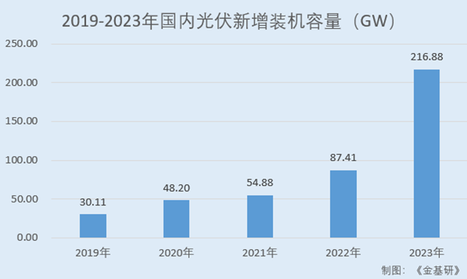 据国家能源局数据,2019-2023年,国内光伏新增装机容量分别为30.11GW、48.20GW、54.88GW、87.41GW、216.88GW,年均复合增长率为63.82%。