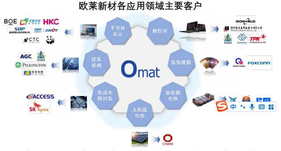 欧莱新材主要代表性客户包括京东方、华星光电、惠科、超视界、彩虹光电、深超光电和中电熊猫等半导体显示面板行业主流厂商,超声电子、莱宝高科、南玻集团、长信科技和TPK(宸鸿科技)等知名触控屏厂商,AGC(旭硝子)、南玻集团、Pilkington(皮尔金顿)和旗滨集团等建筑玻璃龙头厂商。