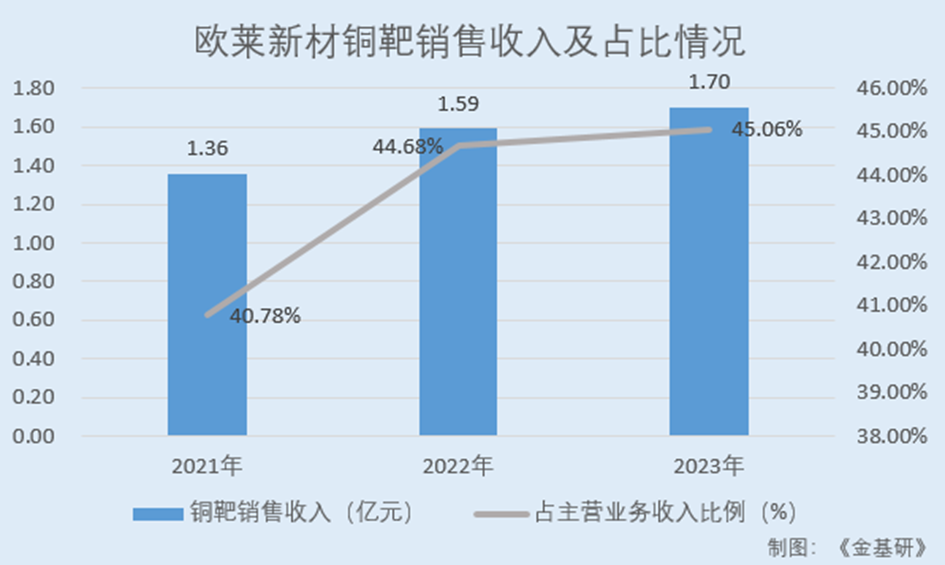 其中,铜靶系欧莱新材核心产品,近三年销售量、销售收入及占比均呈逐年上涨趋势。2021-2023年,欧莱新材铜靶销量分别为1,767.24吨、2,100.74吨、2,359.17吨,销售收入分别为1.36亿元、1.59亿元、1.70亿元,占当期主要营业收入的比例分别为40.78%、44.68%、45.06%。