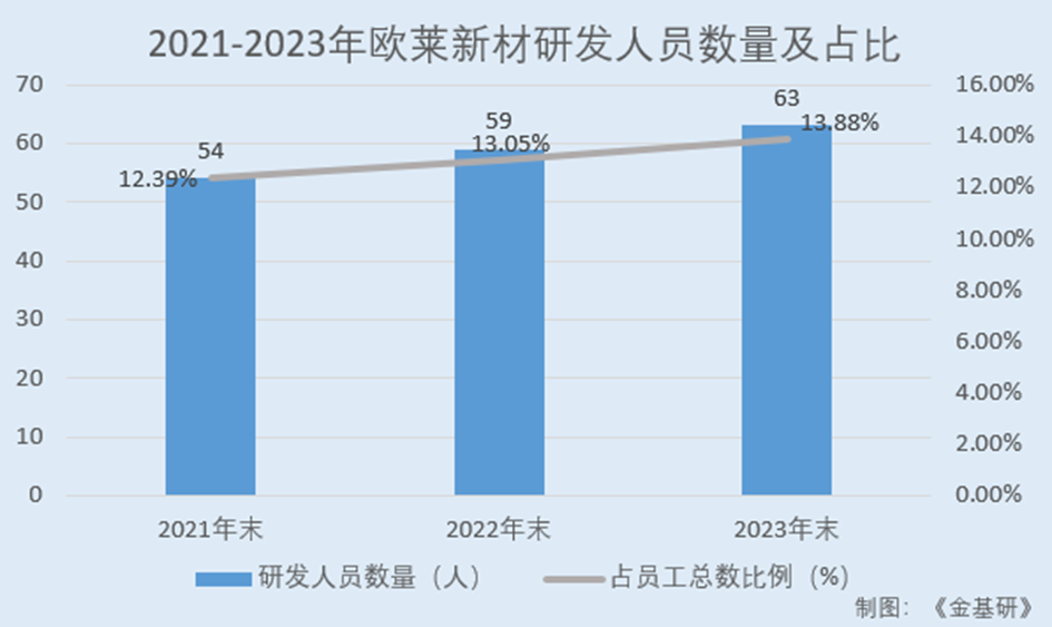 2021-2023年各期末,欧莱新材研发人员数量分别为54人、59人、63人,占员工总数的比例分别为12.39%、13.05%、13.88%。