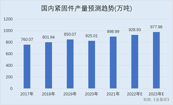 在此背景下,2017年以来,国内紧固件产量呈现出明显的上升趋势,而国内紧固件市场的规模也在持续扩张。