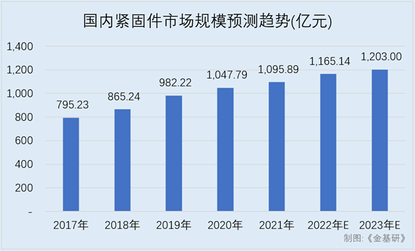 2017-2021年,国内紧固件市场规模分别为795.23亿元、865.24亿元、982.22亿元、1,047.79亿元、1,095.89亿元,2022年约为1,154.14亿元,2023年或将达1,203亿元。国内紧固件市场规模在2017-2023年预计的年化增长率约为7.14%。