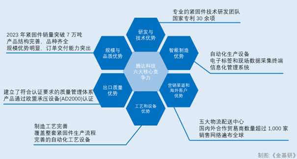 腾达科技目前已具有研发与技术优势、智能制造优势、销售渠道和海外客户优势、工艺和设备优势、出口质量优势、规模与品质优势这六大优势,有望成为世界著名的不锈钢紧固件制造商、销售集成商和特殊行业紧固件技术解决方案提供商。