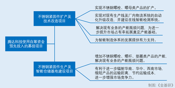 “不锈钢紧固件生产及智能仓储基地建设项目”的实施,一方面能够增加腾达科技不锈钢螺栓、螺杆、垫圈类产品的产能,达产后新增不锈钢螺栓产能25,000吨/年、螺杆产能9,000吨/年、垫圈产能3,000吨/年,解决现有业务的产能瓶颈问题;另一方面,该项目的实施可以令腾达科技进一步辐射华南、华中、西南市场,缩短其产品的运输距离,为其节约运输成本,进一步增强市场竞争力。