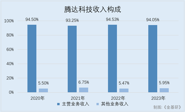 据招股书及2023年年度报告,2020-2023年,腾达科技主营业务收入占收入总额的比例分别为94.5%、93.23%、94.53%、94.05%,四年平均为94.08%。