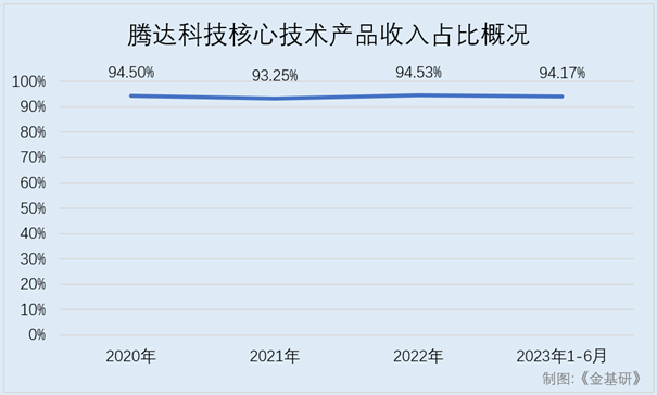 依托在6个方面具有的核心竞争力,近年来,腾达科技核心技术产品占营业收入的比例维持在93%以上。