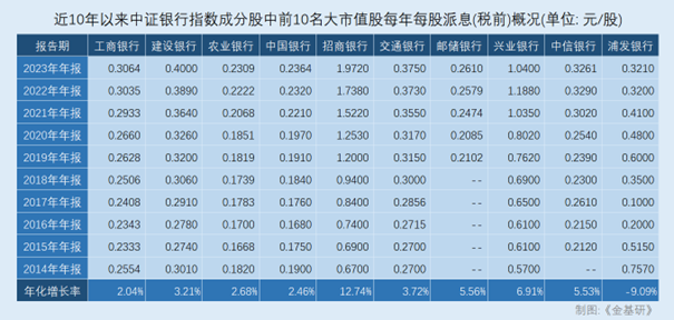 需要指出的是,中证银行指数成分股中的前10名大市值股,有8只在近10年以来每年均分红一次,且有7只银行股每年每股派息(税前)金额呈现出了增长的态势。