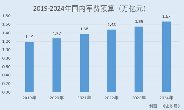 据财政部数据,2019-2023年,国内军费预算分别为1.19万亿元、1.27万亿元、1.38万亿元、1.48万亿元、1.55万亿元。2024年,国内军费预算达1.67万亿元,同比增长7.2%。