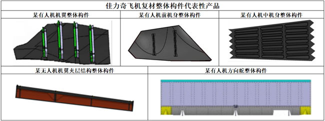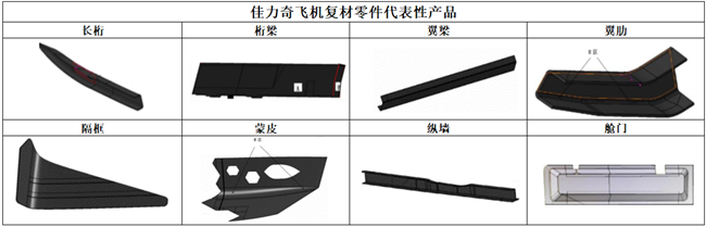 其中,飞机复材零部件业务是佳力奇主营业务收入的最主要来源,飞机复材零件代表性产品有蒙皮、翼梁、翼肋、纵墙、长桁、桁梁、隔框、舱门;飞机复材整体构件有人机机翼整体构件、有人机前机身整体构件、有人机中机身整体构件、无人机机翼夹层结构整体构件、有人机方向舵整体构件。