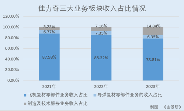 2021-2023年,佳力奇飞机复材零部件业务收入占主营业务收入的比例分别为87.98%、85.32%、78.81%;导弹复材零部件业务的收入占主营业务收入比例分别为6.77%、7.35%、6.35%;制造及技术服务业务收入占主营业务收入的比例分别为5.25%、7.16%、14.84%。2022年,佳力奇新增汽车等其他领域的复材零部件业务收入97.30万元,占当期主营业务收入比例0.16%。