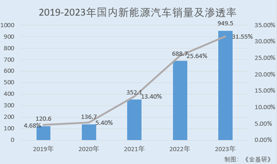 据中汽协数据,2019-2023年,国内新能源汽车销量分别为120.6万辆、136.7万辆、352.1万辆、688.7万辆、949.5万辆,年均复合增长率达67.51%。