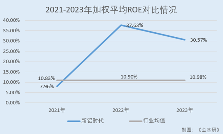 据东方财富choice数据,2021-2023年,新铝时代的加权平均ROE分别为7.96%、37.63%、30.57%。
