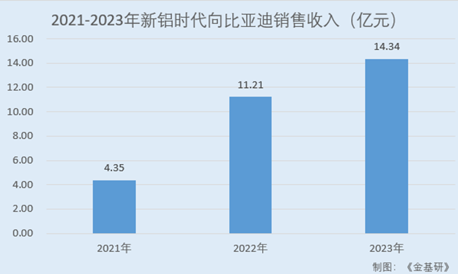 2021-2023年,新铝时代向第一大客户比亚迪销售收入分别为4.35亿元、11.21亿元、14.34亿元,年均复合增长率达81.47%。