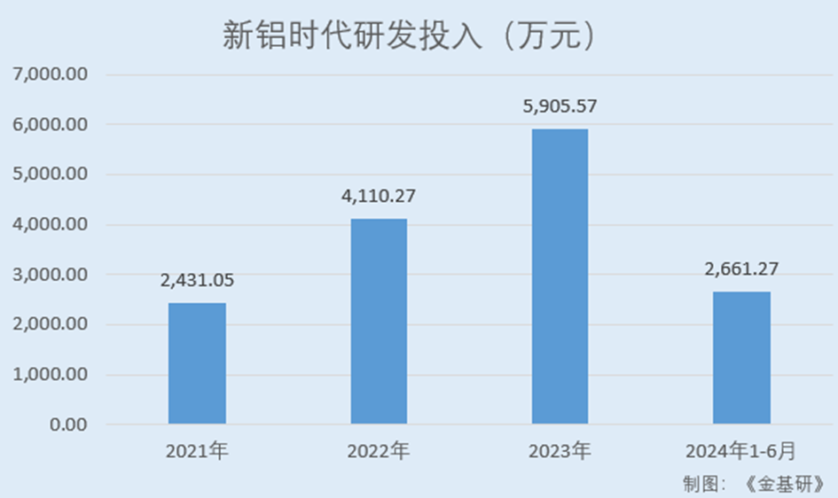 2021-2023年及2024年1-6月,新铝时代研发投入分别为2,431.05万元、4,110.27万元、5,905.57万元、2,661.27万元,近三年年均复合增长率为55.86%。