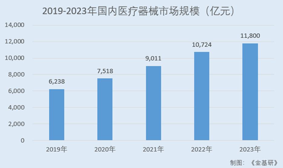 据中物联医疗器械供应链分会数据,2019-2023年,国内医疗器械市场规模分别为6,238亿元、7,518亿元、9,011亿元、10,724亿元、11,800亿元,年均复合增长率为17.28%。
