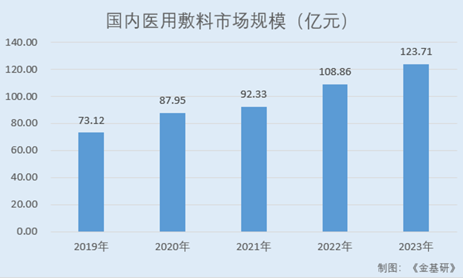 国内方面,据BMI Research及智研咨询数据,2019-2023年,国内医用敷料市场规模分别为73.12亿元、87.95亿元、92.33亿元、108.86亿元、123.71亿元。其中,2023年国内医用敷料市场规模同比增长13.64%。